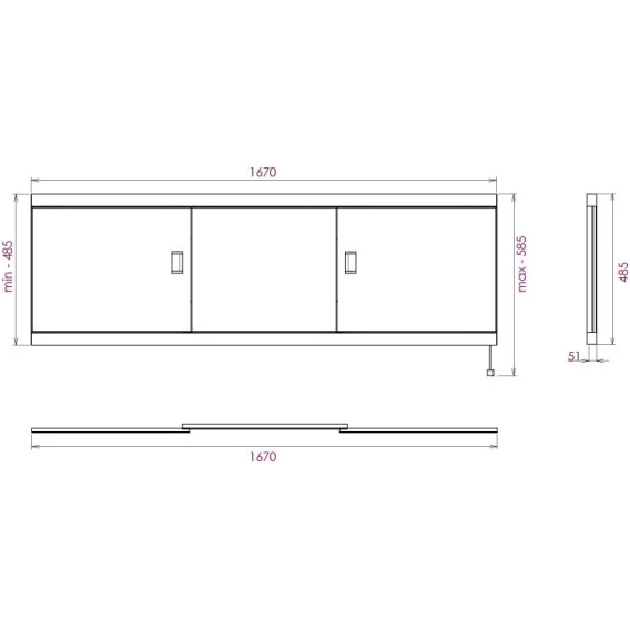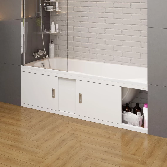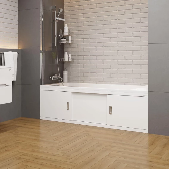 Универсальный экран под ванну Onika Монако-эконом 170 скрывает все расположенные под ванной коммуникации и служит профилактикой скопления загрязнений под чашей ванны. Экран Onika обладает повышенной износостойкостью, отлично переносит эксплуатацию в помещении с высокой влажностью и хорошо сочетается с любыми ваннами. Усиленная рама, состоящая из 2-х частей (верхней и нижней) выполнена из алюминия и окрашена в белый цвет. Благодаря отсутствию боковых стоек рамы, экран можно обрезать по ширине, создавая уникальный размер под нестандартные ванны.Конструкция имеет три подвижные раздвижные двери из МДФ, покрытых высокоглянцевой белой пленкой. Две боковые дверцы с врезными хромированными металлическими ручками. Установка враспор между ванной и полом делает конструкцию особо устойчивой и прочной. Ножки позволяют регулировать экран по высоте от 52 до 60 см, благодаря этому экран является универсальным и впишется в интерьер любой ванной комнаты.