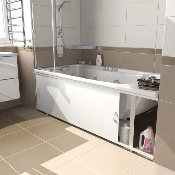 Каркас экрана выполнен из алюминиевого профиля, дверки изготовлены из ПВХ панелей толщиной 0,4 см. Экран имеет 2 раздвижные створки. На пластиковых дверях имеется защитная пленка, которую необходимо удалить после установки экрана. Алюминиевый профиль окрашен порошковой краской белого цвета. Высота экрана 500 мм+ножки 20 мм. Ножки регулируются на 100 мм.