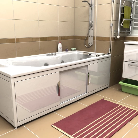 Каркас экрана выполнен из алюминиевого профиля, дверки изготовлены из МДФ и покрыты ПВХ пленкой толщиной 0,45 мм. Экран имеет 3 раздвижных створки. Алюминиевый профиль окрашен порошковой краской белого цвета и собирается на замках, что позволяет дополнительно регулировать экран по высоте. К боковым стойкам возможен монтаж торцевых панелей. Высота экрана 500 мм+ножки 20 мм. Ножки регулируются на 100 мм.