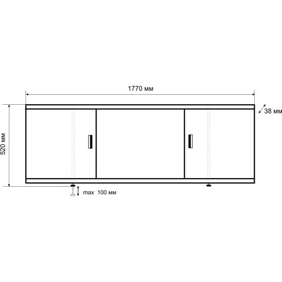 Каркас экрана выполнен из алюминиевого профиля, дверки изготовлены из МДФ и покрыты ПВХ пленкой толщиной 0,45 мм. Экран имеет 3 раздвижных створки. Алюминиевый профиль окрашен порошковой краской белого цвета. Высота экрана 500 мм+ножки 20 мм. Ножки регулируются на 100 мм. Вертикальные стойки смещены к центру, что позволяет при необходимости его подрезать.