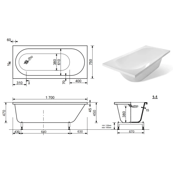 Ванна из литьевого мрамора Эстет Честер FP00000692 170x75 см, белый