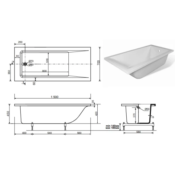 Ванна из литьевого мрамора Эстет Дельта FP00001470 150x70 см, белый