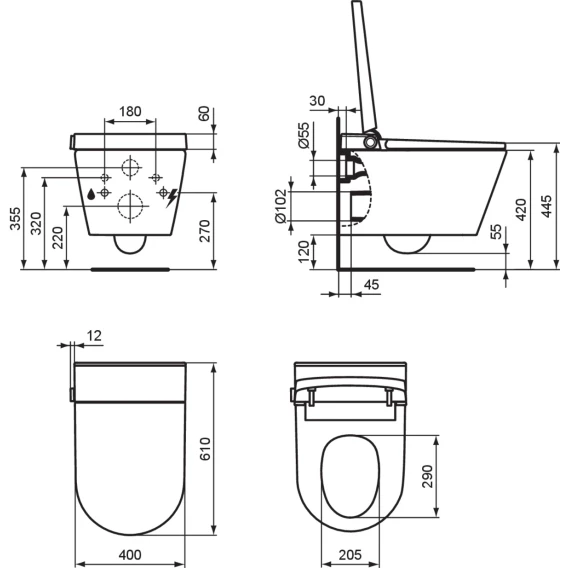 Подводы и подключения: горизонтальный выпуск в стену; требование электропитания (220-240 В) и подключение воды для функции душа.