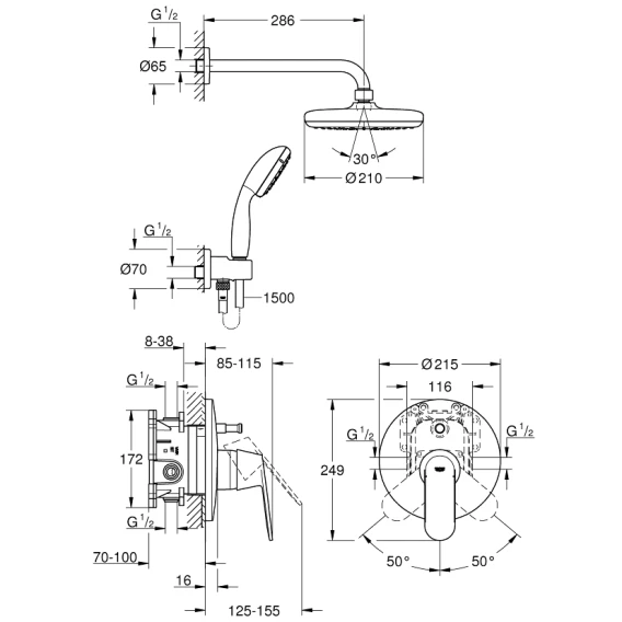Душевой шланг, Душевая лейка, Подключение для душевого шланга с держателем, Верхний душ, Скрытая монтажная часть, Смеситель, Кронштейн
