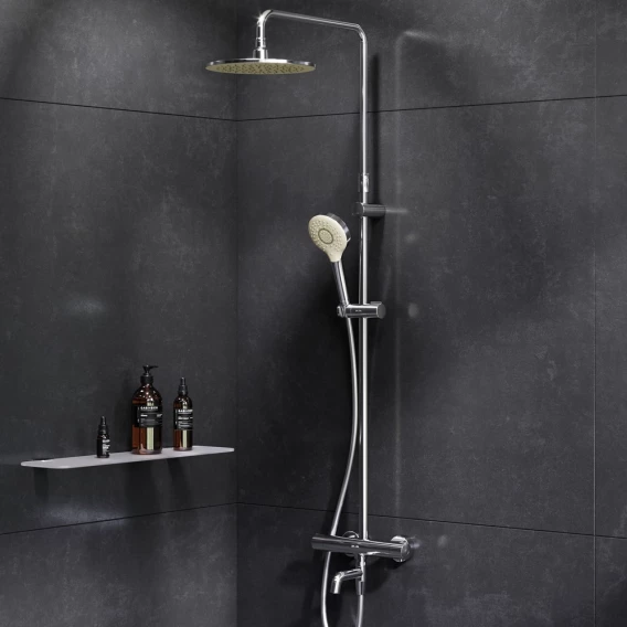 Аэратор, Металлическая розетка, Эксцентрики, Душевой шланг, Душевая лейка, Держатель для душевой лейки, Верхний душ, Кронштейн, Штанга душевая, Термостат