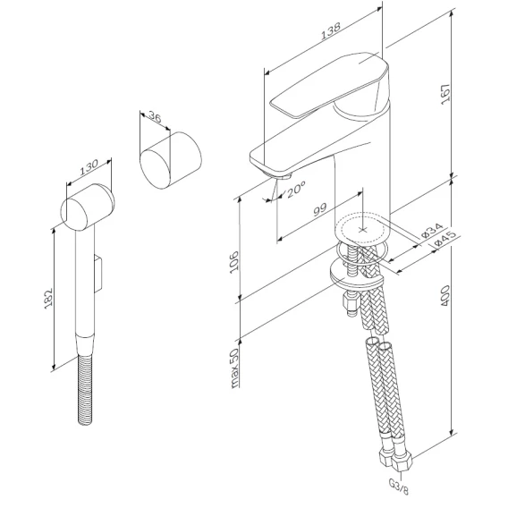 Крепление, Аэратор, Гибкая подводка, Душевой шланг, Душевая лейка, Держатель для душевой лейки