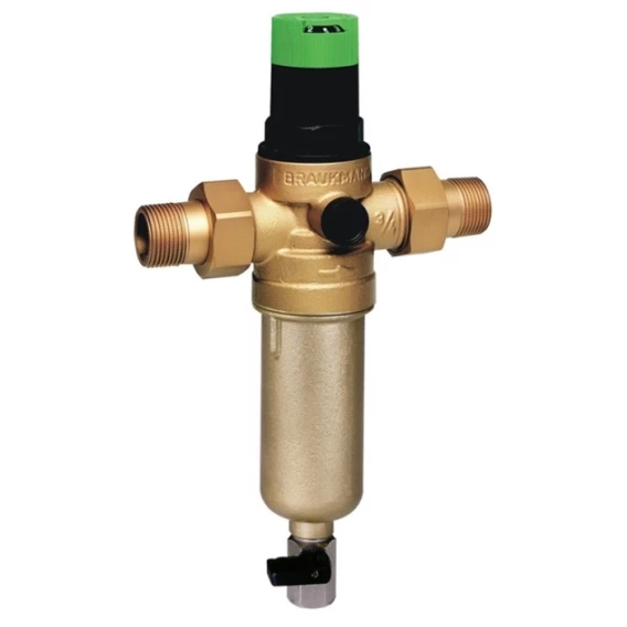 Фильтр представляет собой комбинацию промывного фильтра с клапаном понижения давления. Встроенный в корпус клапан понижения давления позволяет защитить магистрали и устройства водопотребления от нежелательных колебаний давления, а также уменьшить расход воды. Выходное давление регулируется в пределах от 1,5 бар (0,15 МПа) до 6,0 бар (0,6 МПа). На корпусе с двух сторон предусмотрены посадочные места для подключения манометра, позволяющего визуально отслеживать давление воды на выходе. Регулирующая пружина клапана с водой не контактирует. Седло клапана сбалансировано.