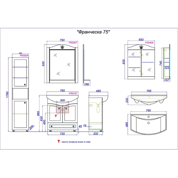 Комплект мебели белый глянец 76,5 см Aqwella Franchesca FR0107 + 4620008197470 + FR0207