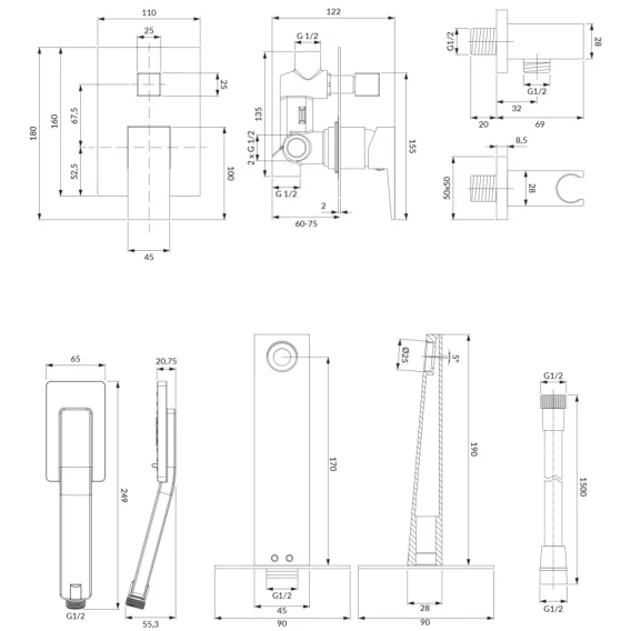Аэратор, Душевой шланг, Душевая лейка, Подключение для душевого шланга с держателем, Излив, Скрытая монтажная часть