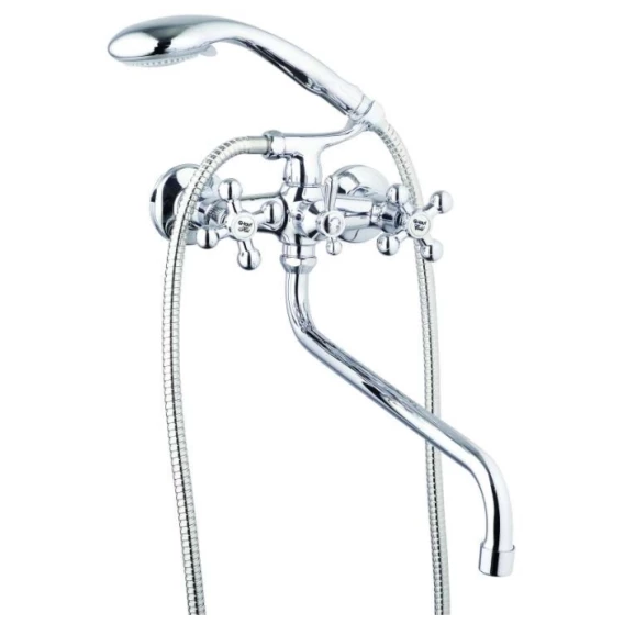 Материал: силумин- Покрытие: Хром- Cпособ крепления : настенный, эксцентрик для импортных смесителей- Кран-букса: керамическая, усиленная (UFX-2238)- Переключатель душа: шаровой (латунь)- Шланг: двухслойный (URG-1103)- Держатель для лейки: на корпусе (Н-03)