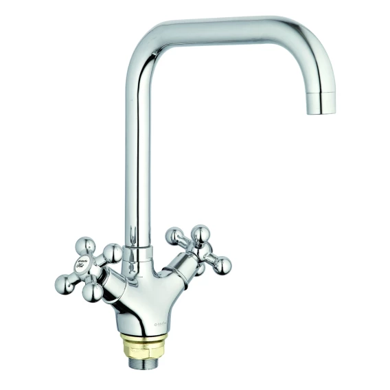 Материал: силумин- Покрытие: хром- Cпособ крепления : вертикальное на гайке- Кран-букса: керамическая, усиленная Ф40 (UFX-2238)- Излив: высокий, поворотный (UCG- 3251)