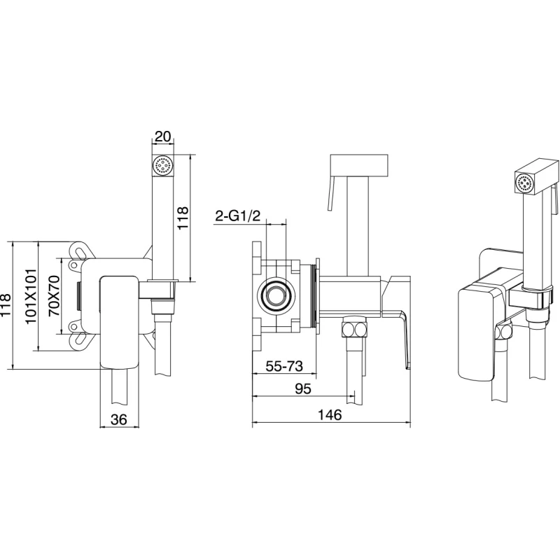 Душевой шланг, Душевая лейка, Подключение для душевого шланга с держателем, Скрытая монтажная часть, Смеситель