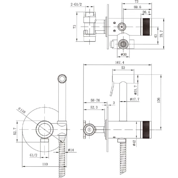 Душевой шланг, Душевая лейка, Подключение для душевого шланга с держателем, Скрытая монтажная часть, Смеситель