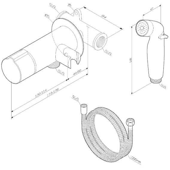 Душевой шланг, Душевая лейка, Подключение для душевого шланга с держателем, Скрытая монтажная часть, Смеситель