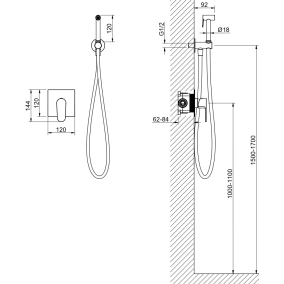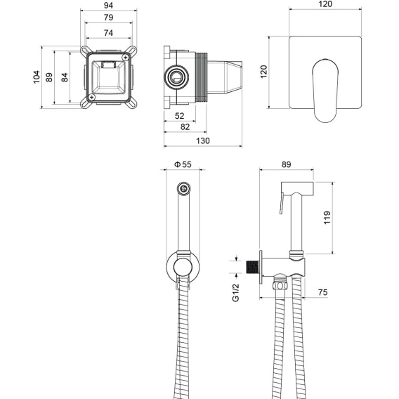 Душевой шланг, Душевая лейка, Подключение для душевого шланга с держателем, Скрытая монтажная часть, Смеситель