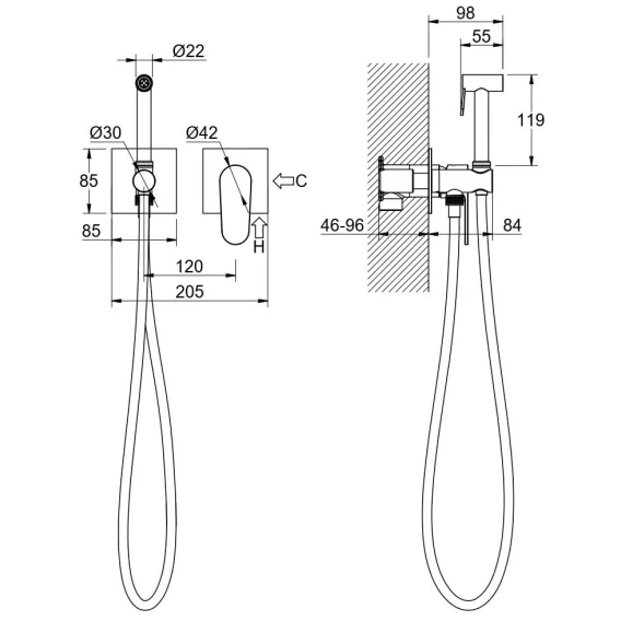 Душевой шланг, Душевая лейка, Подключение для душевого шланга с держателем, Скрытая монтажная часть, Смеситель