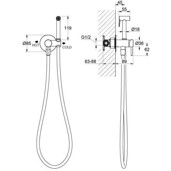 Душевой шланг, Душевая лейка, Подключение для душевого шланга с держателем, Скрытая монтажная часть, Смеситель
