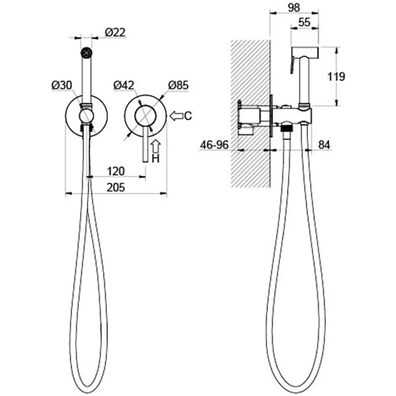 Душевой шланг, Душевая лейка, Подключение для душевого шланга с держателем, Скрытая монтажная часть, Смеситель