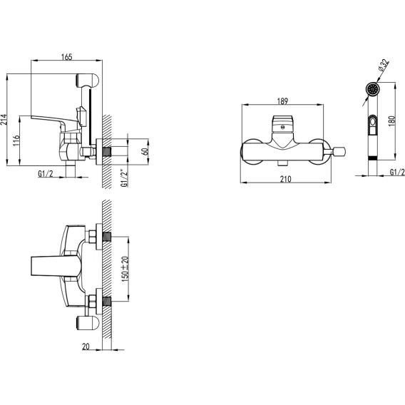 Металлическая розетка, Эксцентрики, Душевой шланг, Душевая лейка, Держатель для душевой лейки, Смеситель