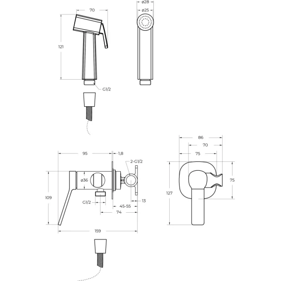 Душевой шланг, Душевая лейка, Подключение для душевого шланга с держателем, Скрытая монтажная часть, Смеситель