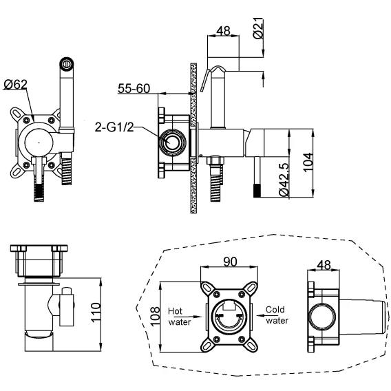 Душевой шланг, Душевая лейка, Подключение для душевого шланга с держателем, Скрытая монтажная часть, Смеситель