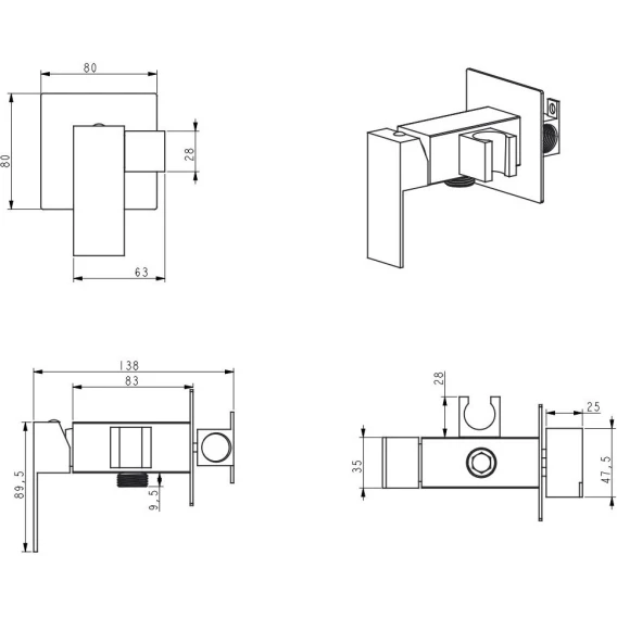 Душевой шланг, Душевая лейка, Подключение для душевого шланга с держателем, Скрытая монтажная часть, Смеситель