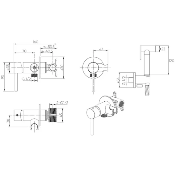 Душевой шланг, Душевая лейка, Подключение для душевого шланга с держателем, Скрытая монтажная часть, Смеситель