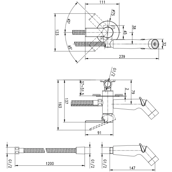 Душевой шланг, Душевая лейка, Подключение для душевого шланга с держателем, Скрытая монтажная часть, Смеситель