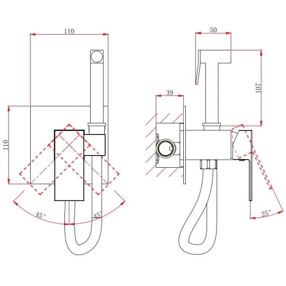 Душевой шланг, Душевая лейка, Подключение для душевого шланга с держателем, Скрытая монтажная часть, Смеситель