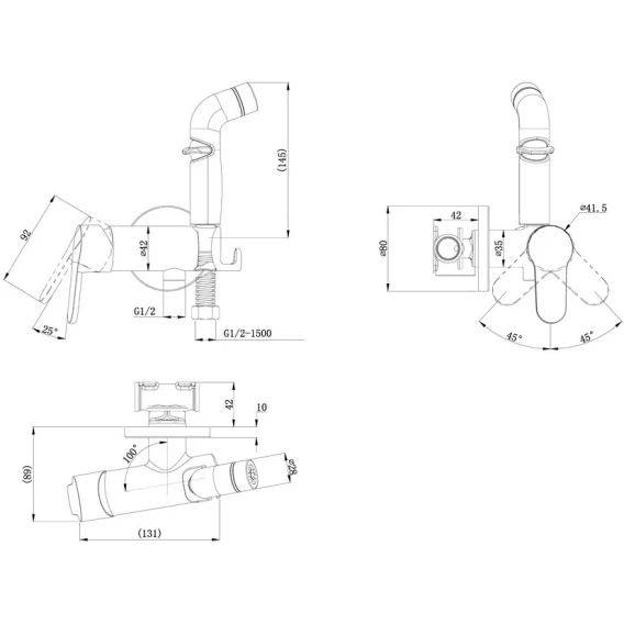 Душевой шланг, Душевая лейка, Подключение для душевого шланга с держателем, Крючок, Скрытая монтажная часть, Смеситель