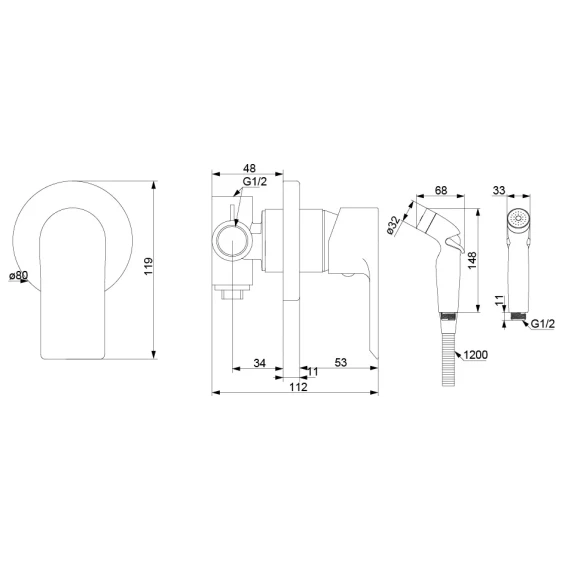 Душевой шланг, Душевая лейка, Держатель для душевой лейки, Подключение для душевого шланга, Скрытая монтажная часть, Смеситель