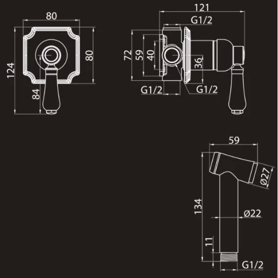Душевой шланг, Душевая лейка, Подключение для душевого шланга с держателем, Скрытая монтажная часть, Смеситель
