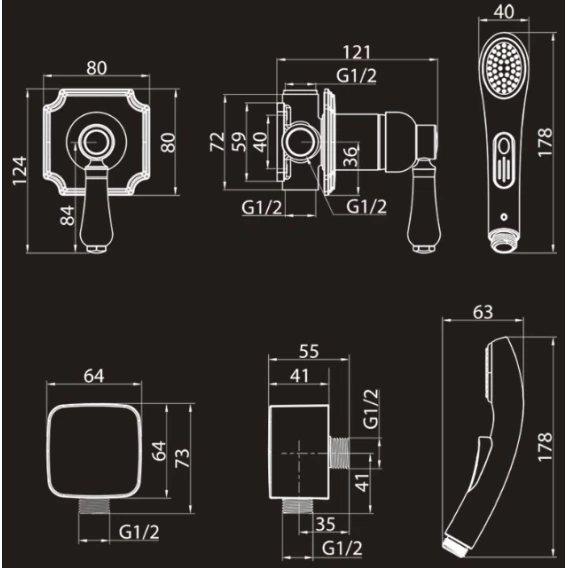 Душевой шланг, Душевая лейка, Держатель для душевой лейки, Подключение для душевого шланга, Скрытая монтажная часть, Смеситель