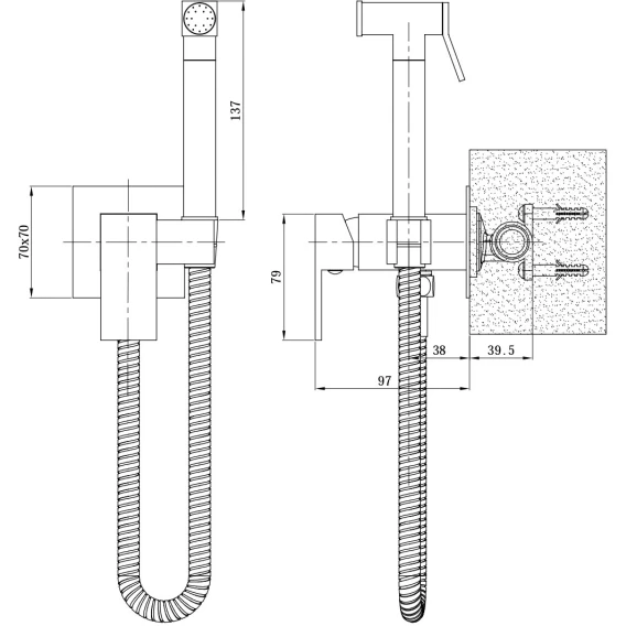 Душевой шланг, Душевая лейка, Подключение для душевого шланга с держателем, Скрытая монтажная часть, Смеситель