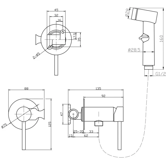 Душевой шланг, Душевая лейка, Подключение для душевого шланга с держателем, Скрытая монтажная часть, Смеситель