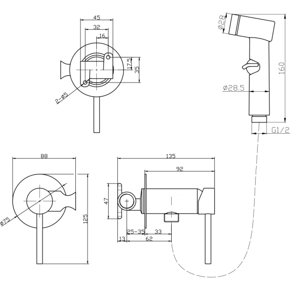 Душевой шланг, Душевая лейка, Подключение для душевого шланга с держателем, Скрытая монтажная часть, Смеситель