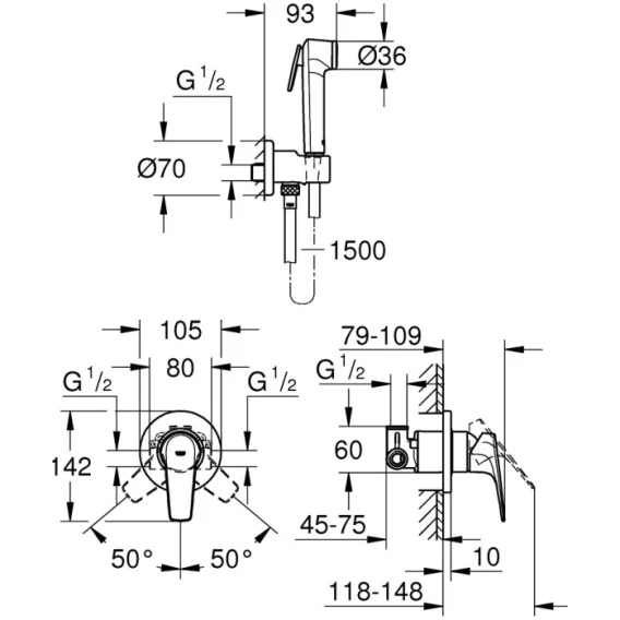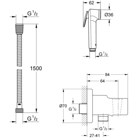 Душевой шланг, Душевая лейка, Подключение для душевого шланга с держателем, Скрытая монтажная часть, Смеситель