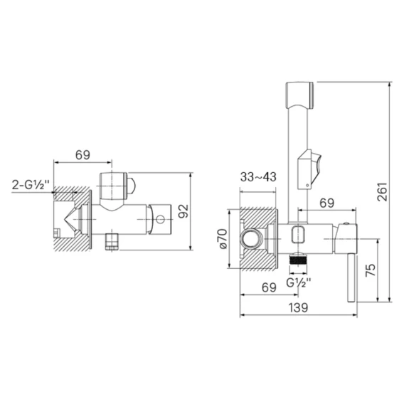 Душевой шланг, Душевая лейка, Подключение для душевого шланга с держателем, Крючок, Скрытая монтажная часть, Смеситель