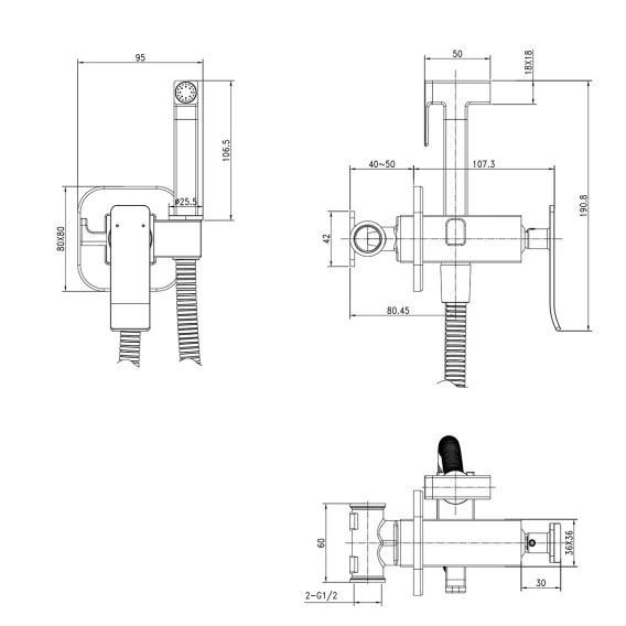 Душевой шланг, Душевая лейка, Подключение для душевого шланга с держателем, Скрытая монтажная часть, Смеситель