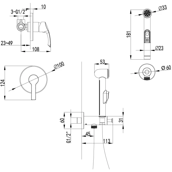 Душевой шланг, Душевая лейка, Подключение для душевого шланга с держателем, Скрытая монтажная часть