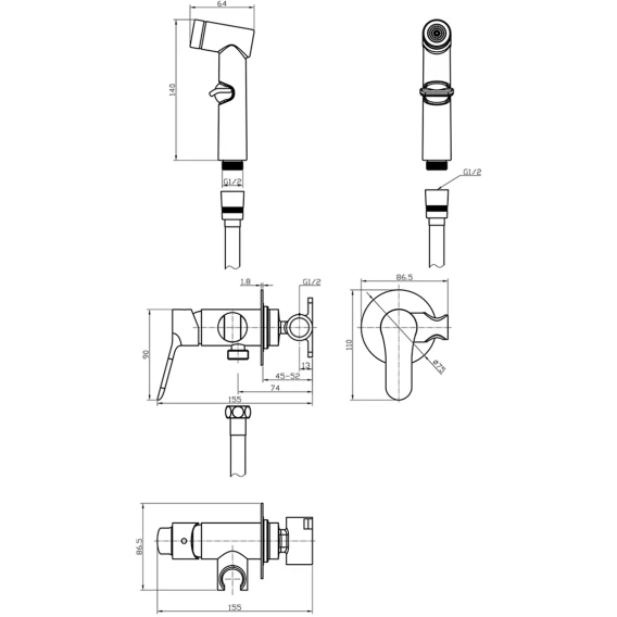 Душевой шланг, Душевая лейка, Подключение для душевого шланга с держателем, Скрытая монтажная часть, Смеситель