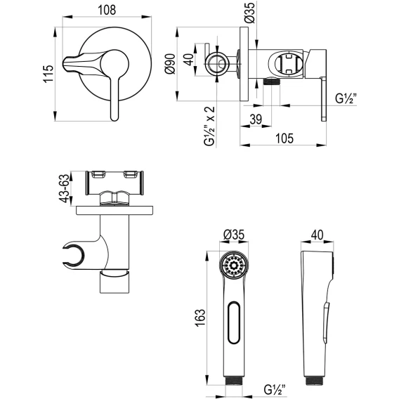 Душевой шланг, Душевая лейка, Подключение для душевого шланга с держателем, Крючок, Скрытая монтажная часть, Смеситель