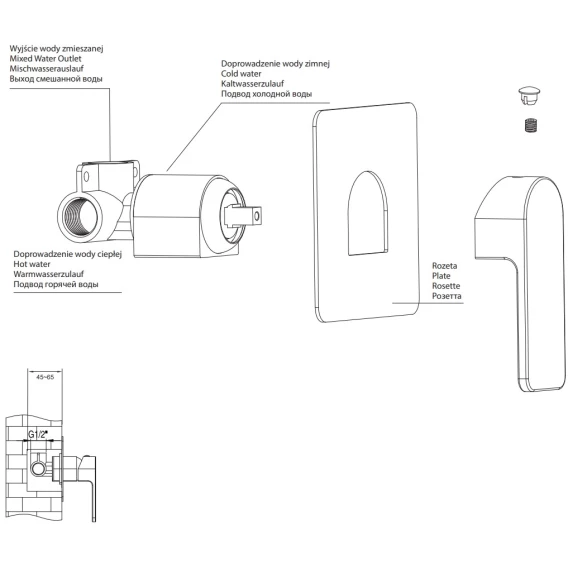 Душевой шланг, Душевая лейка, Подключение для душевого шланга с держателем, Скрытая монтажная часть, Смеситель