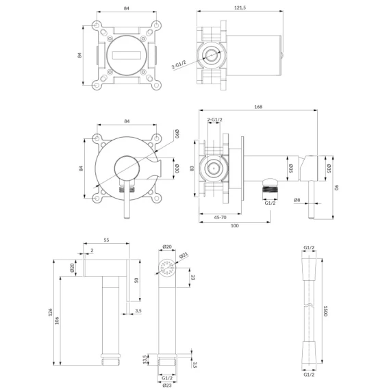 Душевой шланг, Душевая лейка, Подключение для душевого шланга с держателем, Скрытая монтажная часть, Смеситель