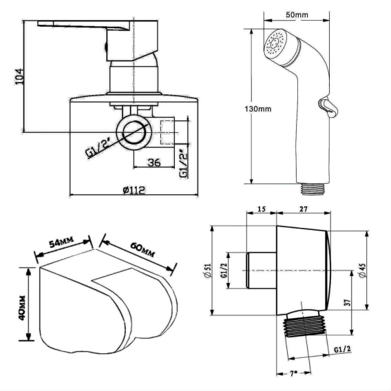 Душевой шланг, Душевая лейка, Держатель для душевой лейки, Подключение для душевого шланга, Скрытая монтажная часть, Смеситель