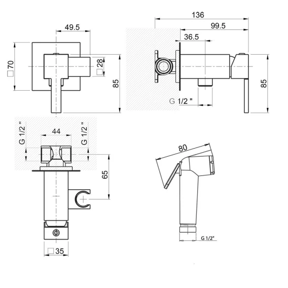 Душевой шланг, Душевая лейка, Подключение для душевого шланга с держателем, Скрытая монтажная часть