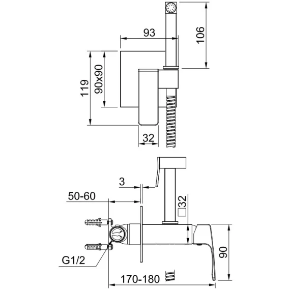 Душевой шланг, Душевая лейка, Подключение для душевого шланга с держателем, Скрытая монтажная часть, Смеситель