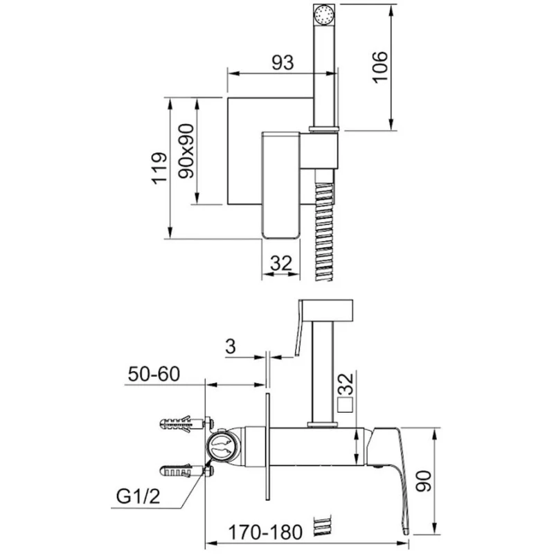 Душевой шланг, Душевая лейка, Подключение для душевого шланга с держателем, Скрытая монтажная часть, Смеситель