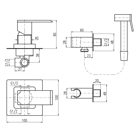 Душевой шланг, Душевая лейка, Подключение для душевого шланга с держателем, Скрытая монтажная часть