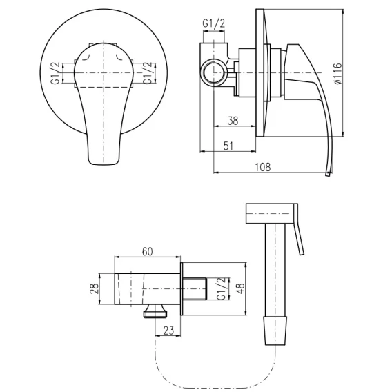 Душевой шланг, Душевая лейка, Подключение для душевого шланга с держателем, Скрытая монтажная часть